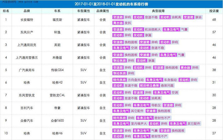 最后来看看上图这组数据,2016年发动机投诉量前十的车型,分别为福克斯、轩逸、英朗、科鲁兹、传祺GS4、哈弗H2、雪铁龙C4L、帝豪、众泰T600、哈弗H6。