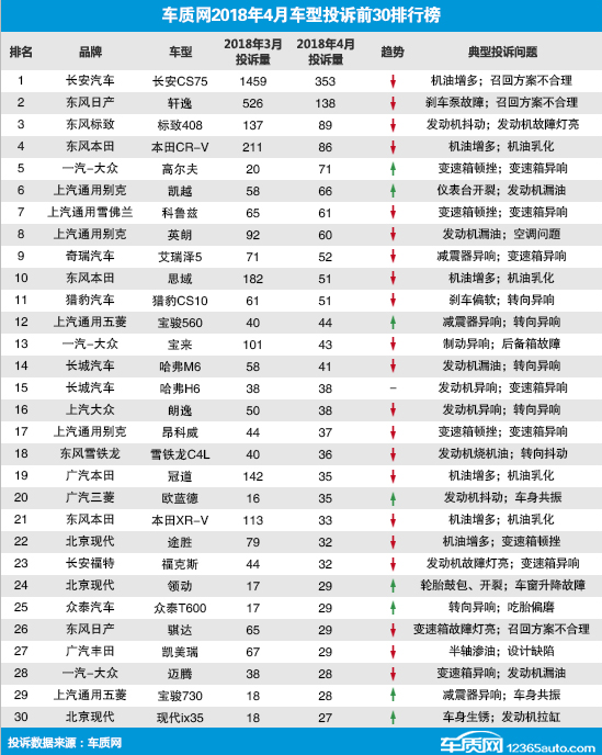 看完这个排名,咱们来看看车质网4月份发布的车型投诉前30排行榜