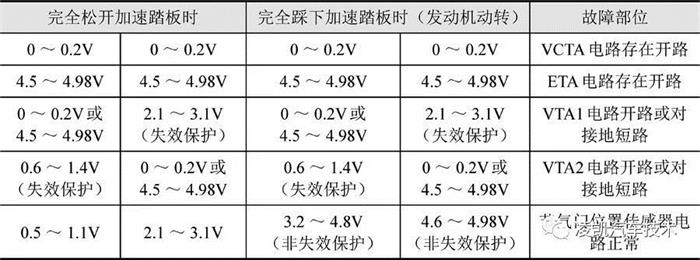 ② 检查传感器的信号电压:连接故障诊断仪,接通点火开关,踩动加速踏板,并读取节气门位置传感器数据VTA1和VTA2读数,数值应符合下表。