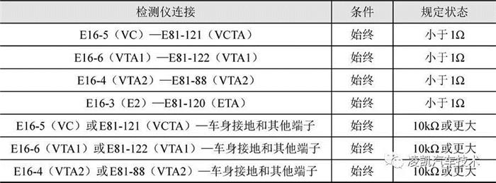 ③ 检查传感器线束及插接器:断开节气门体插接器E16和发动机控制单元ECM插接器E81,按照下表所示检查插接器之间或插接器与车身接地之间的电阻值。电阻值应符合表中所示,如不符合更换或检查线束。