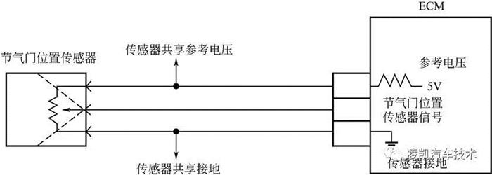 节气门关闭时,传感器输出电压降低;节气门打开时,传感器输出电压升高。ECM根据这些信号计算节气门开度,并控制节气门执行器来响应驾驶员输入。这些信号同时也用来计算空燃比修正值、功率提升修正值和燃油切断控制。