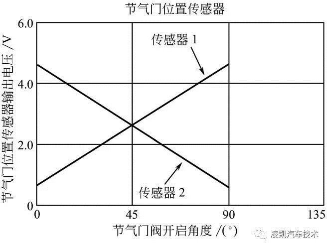 节气门轴上的双轨道节气门位置传感器用来监控节气门准确开度,节气门位置传感器(两个电位计)的滑片与节气门同轴。当节气门转动时,电位计滑片同步转动。当加上5V工作电压后,变化的电阻转化为电压输出信号。电位计的输出电压随节气门的位置变化而改变,可使控制单元准确知道节气门的开度。由于两个电位计是反相安装,因此当节气门位置发生变化时,两路信号电压均线性变化,其中一个增加,同时另一个减小。下图是日产车系节气门位置传感器输出特性。