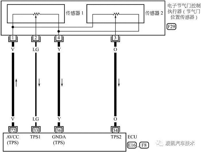 发动机控制单元ECM通过72#端子向传感器1#端子提供5V参考电压;传感器4#端子通过电控单元36#端接地。传感器2#端和3#端输出TPS1和TPS2节气门位置信号分别送到发动机控制系统的33# 端、36#端。