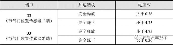 打开点火开关,将换挡杆换到D挡(A/T)或1挡(M/T),使用万用表电压挡分别检查ECM的端口33(节气门位置传感器1#端的信号)、34(节气门位置传感器2#端的信号)在加速踏板不同状态时与接地之间的电压,检查结果应符合下表规定。如不符合则更换节气门体总成。
