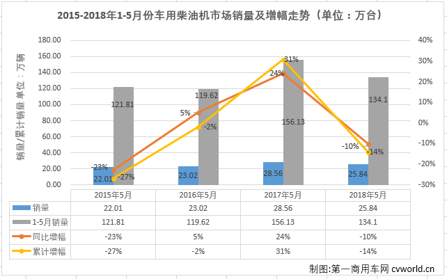 第一商用车网最新获悉,2018年5月份,我国车用柴油机市场共计销售25.84万台,同比下降10%,较去年同期销量减少2.75万台(注:此数据未统计到潍柴5月份的销量)。