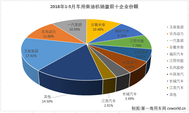 从累计销量看,车用柴油机市场2018年1-5月累计销售134.10万台,同比累计下降14%,剔除潍柴2017年同期销量,则累计降幅约为2%(潍柴2017年1-5月累计销售19.68万台)。具体到5月销量前十企业来看,3增7降,增幅最高的是长城汽车,达到24%。