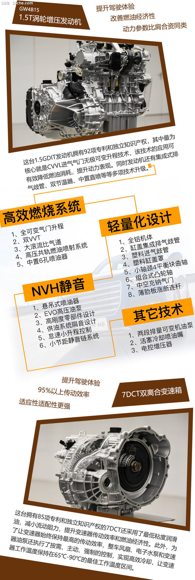 总结:哈弗全新1.5T动力总成系统,由WG4G15B换装成最新的WF4B15型,主要搭载在哈弗H6热门车型中,不仅动力有明显提升,而且在整车燃油经济性上也有不小成功。这当然要靠CVVL、VVT、缸盖集成水冷排气歧管等技术,使得这台1.5T发动机得到了业内一致好评。