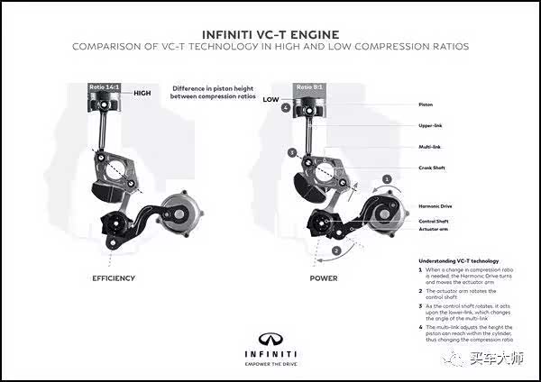通过监测司机驾驶习惯,VC-T发动机的控制系统会对发动机复杂的连杆机构进行调整,进而改变活塞行程,实现可变压缩比。