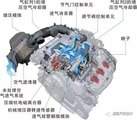 空气供给系统的中心部件是安装在发动机的两个V型气缸中间的增压模块。