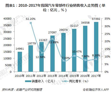 近年来,中国汽车零部件行业市场规模的发展速度趋于稳定。根据中国汽车工业协会统计数据显示,2017年,我国汽车零部件制造企业实现销售收入37392亿元,同比增长8.20%。