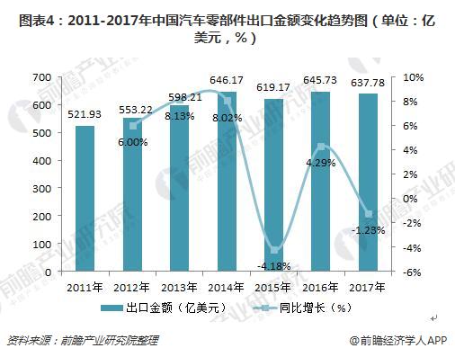 2016年,我国汽车零部件出口结束了2015年的负增长局面,累计出口金额为645.73亿美元,较上年同比增长4.29%,汽车零部件出口市场出现了复苏迹象。但2017年,汽车零部件出口金额再度小幅下滑,累计出口金额637.78亿美元,同比下滑1.23%。