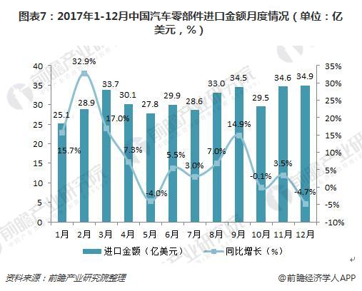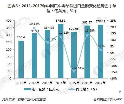 2011-2017年,我国汽车零部件进口金额呈现波动变化的趋势。2017年,我国汽车零部件累计进口金额为370.48亿美元,较上年同比增长1.9%,进口额进一步增加。