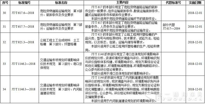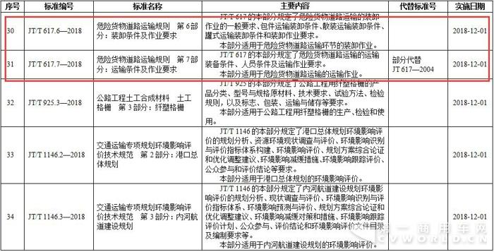 小编注意到,此次新发布的34项交通运输行业标准将于今年的12月1日正式实施。对于大家比较关心的《危险道路货运运输准则》的行业新准则,小编进行了重点摘取,方便大家浏览(一共涉及7条标准):