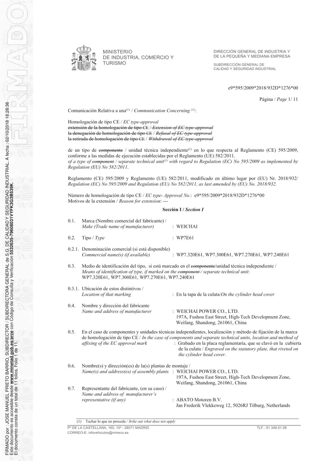 2018年10月9日,潍柴以000001编号获得国家生态环境部的环保信息公开单,标志着潍柴WP4.6N发动机顺利取得重型柴油机国六b官方认证。