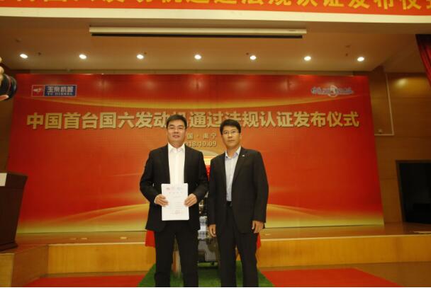 10月9日,中国首台国六发动机通过法规认证新闻发布仪式在广西南宁举行,国家授权检测机构中汽研汽车检验中心(天津)有限公司向玉柴移交了检测报告及相关证书。早在10月1日,玉柴YCK08发动机在中汽研汽车检验中心(天津)有限公司便通过了我国重型车国6b阶段排放标准认证,成为国内第一款拿到国6b阶段排放标准认证报告的国六柴油发动机。