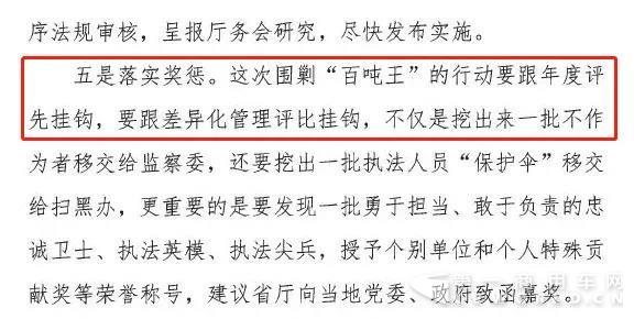 这次围剿“百吨王”的行动要跟年度评先挂钩,要跟差异化管理评比挂钩,不仅是挖出来一批不作为者移交给监察委,还要挖出一批执法人员“保护伞”移交给扫黑办。