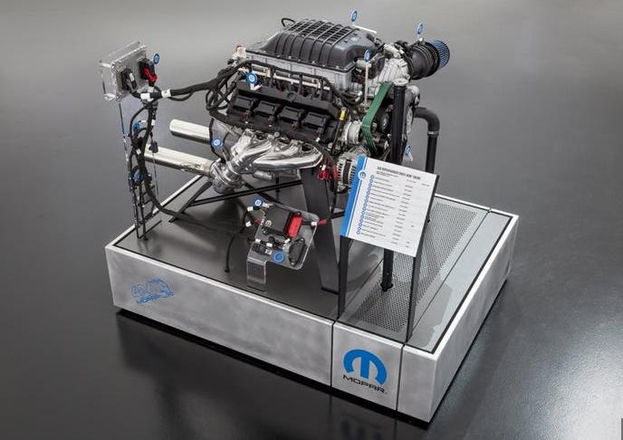 除发动机外,Mopar还提供了对应套件,包括:动力总成控制模块、动力分配中心、发动机导线线束(engine wiring harness)、底盘线束(chassis harness)、加速器踏板(油门踏板,accelerator pedal)、接地跳线(ground jumper)、氧气传感器(oxygen sensors)、增压空气温度传感器(charge air temperature sensors)、燃油泵控制模组、凸轮总线接口设备。