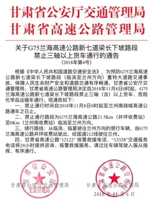 为预防G75兰海高速公路新七道梁长下坡路段(临洮至兰州方向)重特大道路交通事故,保障人民生命财产安全和道路交通有序畅通,甘肃省公安厅交通管理局、甘肃省高速公路管理局决定自2018年11月8日0时起,G75兰海高速公路新七道梁长下坡路段禁止三轴(含)以上货车、危险化学品运输车通行。现通告如下: