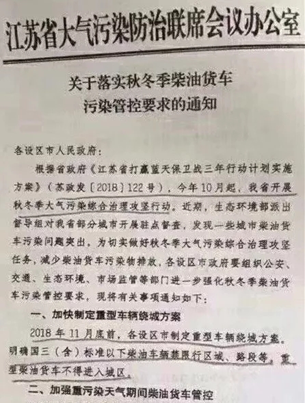 今年10月起,江苏省开展秋冬季大气污染综合治理攻坚行动,明确重型柴油货车不得进城、进厂区,尾气超标将被依法处罚!