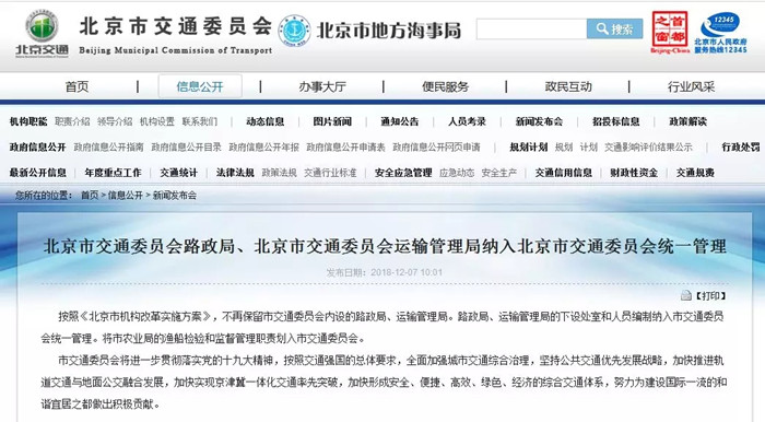 12月7日,北京市交通委员会发布通知,表示将按照《北京市机构改革实施方案》,不再保留市交通委员会内设的路政局、运输管理局。路政局、运输管理局的下设处室和人员编制纳入市交通委员会统一管理。