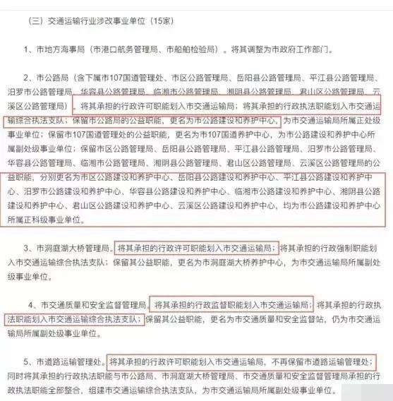 早在2017年9月6日,岳阳市就对运管部门进行了职能转交,不再有处罚权,其以后的工作更倾向于公益职能,比如公路保养、维护等等。