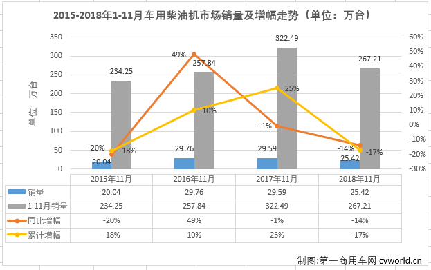 2018年11月份,我国车用柴油机市场共计销售25.42万台,同比下降14%,较去年同期减少4万余台(注:此数据未统计到潍柴11月份的销量)。