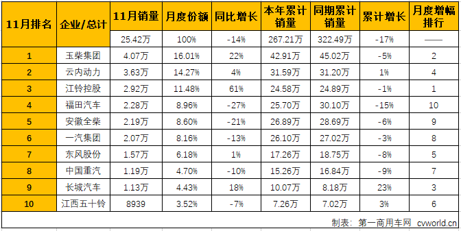 由上表可见,11月份车用柴油机市场同比下降14%(剔除2017年同期潍柴销量,实际约下滑2%)。具体到销量前十企业来看,5增5降,玉柴、云内、江铃、一汽、东风股份和长城汽车实现增长,增幅最高的是本月排名第三的江铃,同比增长了61%。遭遇下滑的5家企业有四家降幅为两位数,降幅最高的是福田汽车,11月份销量同比下降了27%,全柴的降幅也超过20%。