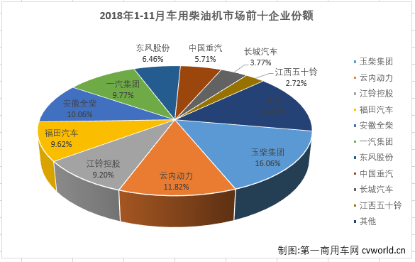 从累计销量来看,车用柴油机市场在2018年1-11月累计下降17%,具体到11月份前十企业来看,3增7降,降幅最大的是福田,前11月销量累计下降15%,累计降幅较前10月(-13%)进一步扩大,福田也是销量前十企业中唯一一家累计降幅为两位数的企业,东风股份和重汽的降幅也分别达到8%和9%。