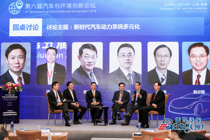 从左至右依次为:奕森科技总裁辛军,浙江吉利动力总成研究院副院长沈源,上汽集团乘用车技术中心总监徐政,中国电动汽车百人会高级技术顾问、华泰汽车集团副总裁、江苏大学教授韩尔樑,同济大学汽车学院教授韩志玉,河北工业大学新能源车研究中心主任陈勇