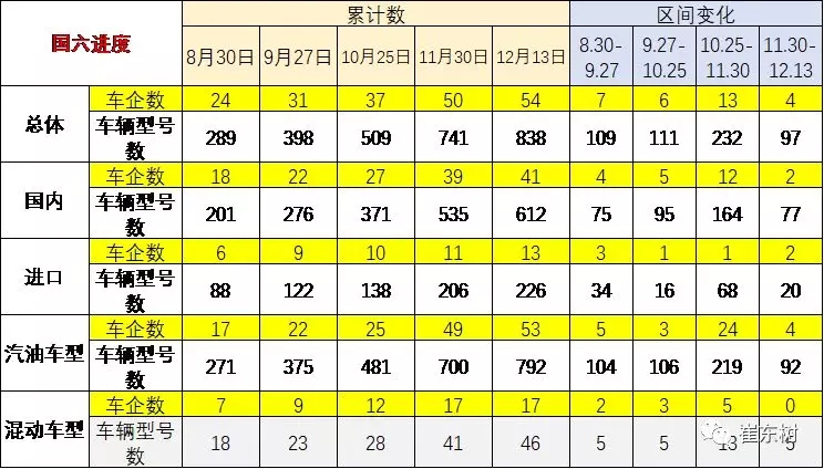 目前的国六车型的推进速度较慢,这是公开的国六信息的汇总。原文为:截至2018年12月13日,共有54家企业838个车型(1402个信息公开编号)630363辆车进行了国六环保信息公开,与上周汇总环比增加48个车型、62735辆车。其中,国内生产企业41家、612个车型、535922辆,国外生产企业13家、226个车型、94441辆;轻型汽油车企业53家、792个车型、620791辆,轻型混合动力车企业17家、46个车型、9572辆。公开车型均为国六b(除1款进口车型为国六a外)。