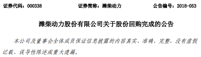 12月29日,潍柴动力股份有限公司(下称“公司”)发布关于股份回购完成的公告。公告显示,公司2018年10月8日首次以集中竞价交易方式回购公司股份,于2018年12月28日实施最后一笔回购交易。在此期间,公司以集中竞价方式回购A股股份共计63,364,661股,占公司总股本的比例约为0.79%,支付的总金额为人民币499,911,217.21元(不含交易费用)。