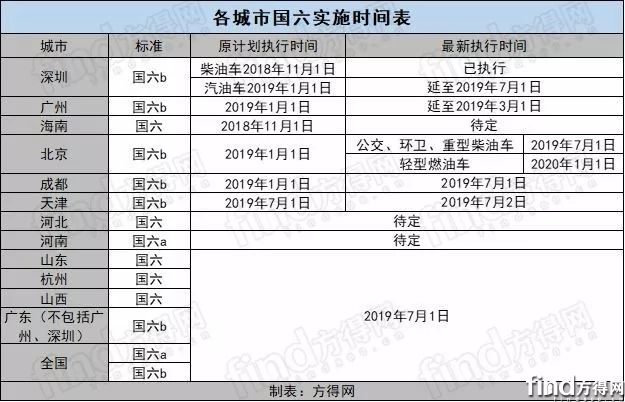 深圳延缓至2019年7月1号;广州延迟到2019年3月1号;而海南的时间尚未出台;北京的时间确定为2020年1月1号,公交车,环卫车重型柴油车推迟至2019年7月1号;成都、山东、杭州、山西、广东、安徽、天津推迟为2019年7月1号。另外,河北和河南、海南都处在待通知状态。
