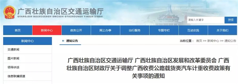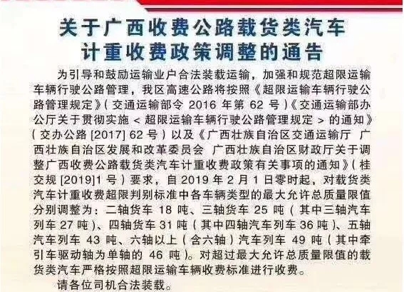 近日,小编从广西自治区交通运输厅了解到,为降低物流运输成本,引导和鼓励运输业户合法装载运输,加强和规范超限运输车辆行驶公路管理,自治区交通运输厅等联合印发《关于调整广西收费公路载货类汽车计重收费政策有关事项的通知》。从2019年2月1日起,广西载货类汽车计重收费的超限判别标准,及计重收费吨位区间将进行调整。