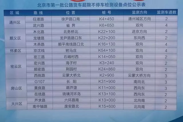 据介绍,已完成的15处公路超限不停车检测设施主要分布在通州、顺义、怀柔、密云、房山、大兴等六个区的重要货运通道上,具体路段为:通州区武兴路、任港路,顺义区木北路、龙塘路、木燕路,怀柔区京密路驸马庄,密云区密三路、左堤路、顺密路、西统路,房山区G107长阳、黄良路葫芦垡、岳琉路,大兴区芦求路、南中轴路。