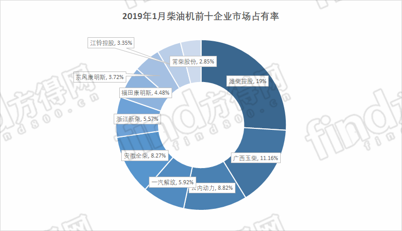 2019年1月柴油机前十企业份额总和为73.13%,前十集中度较上月(71.24%)提高。其中,潍柴在1月的占有率达到了19%。