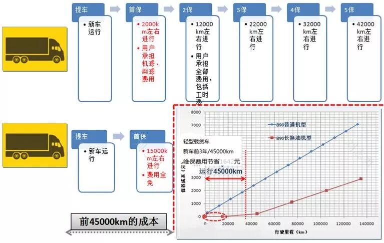 新车前4.5万公里(预期三包期内),用户降低保养成本1600元左右。前10万公里,降低用户使用成本达4000元。