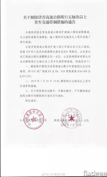 目前济青高速公路改扩建工程小许家以东已交工验收,依据《中华人民共和国道路交通安全法》等规定,山东省公安厅高速公路交通警察总队一支队、山东高速股份有限公司决定解除限行五轴及以上货车交通管制措施。