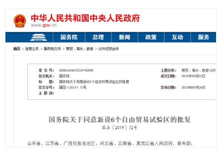 日前,国务院印发《中国(山东)、(江苏)、(广西)、(河北)、(云南)、(黑龙江)自由贸易试验区总体方案》,并公布了自由贸易区的范围、特点和划分目的。