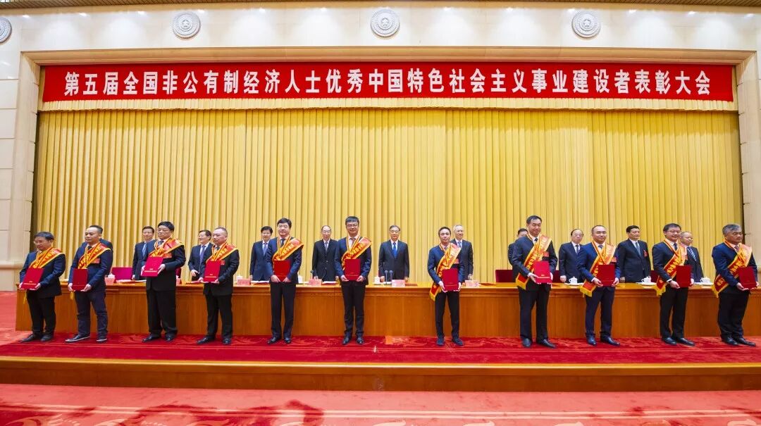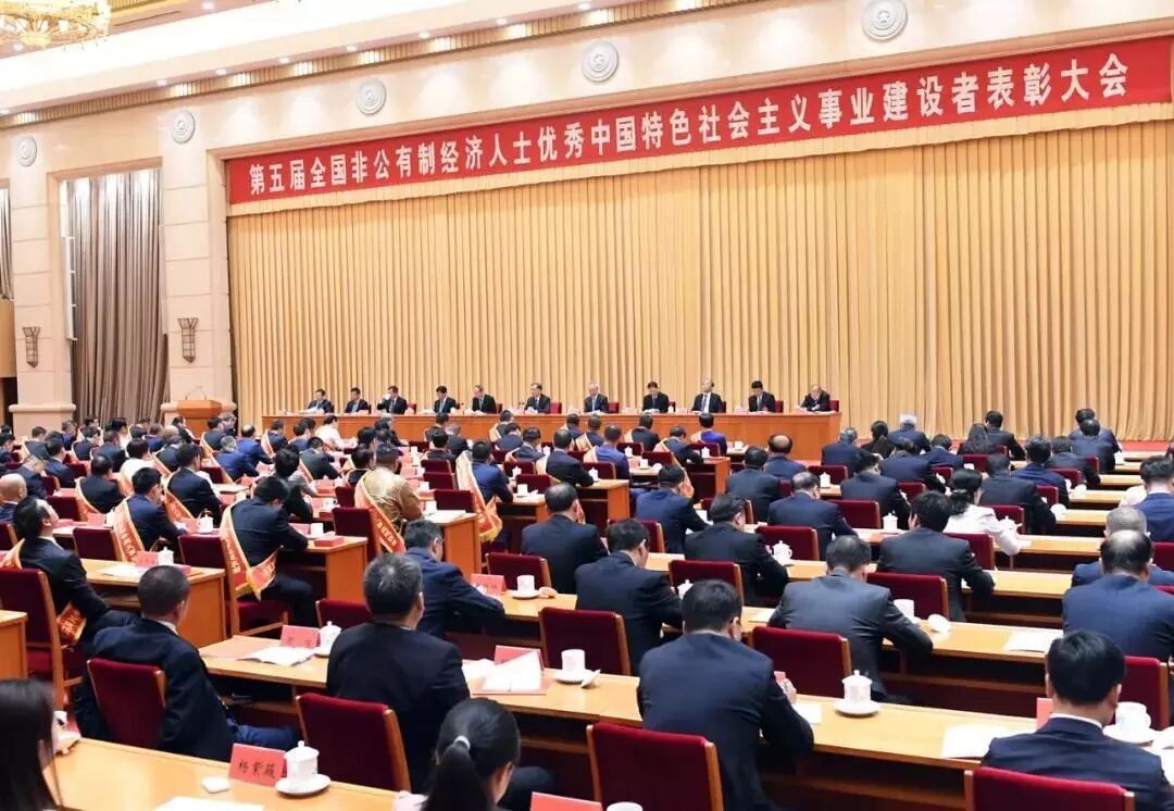 2019年8月29日上午,第五届全国非公有制经济人士优秀中国特色社会主义事业建设者表彰大会在京隆重召开,中共中央政治局常委、全国政协主席汪洋出席大会并讲话。中央政治局委员、国务院副总理刘鹤,中央书记处书记、中央统战部部长尤权,全国人大副委员长郝明金,全国政协副主席、全国工商联主席高云龙为获表彰的民营企业家颁牌并合影。