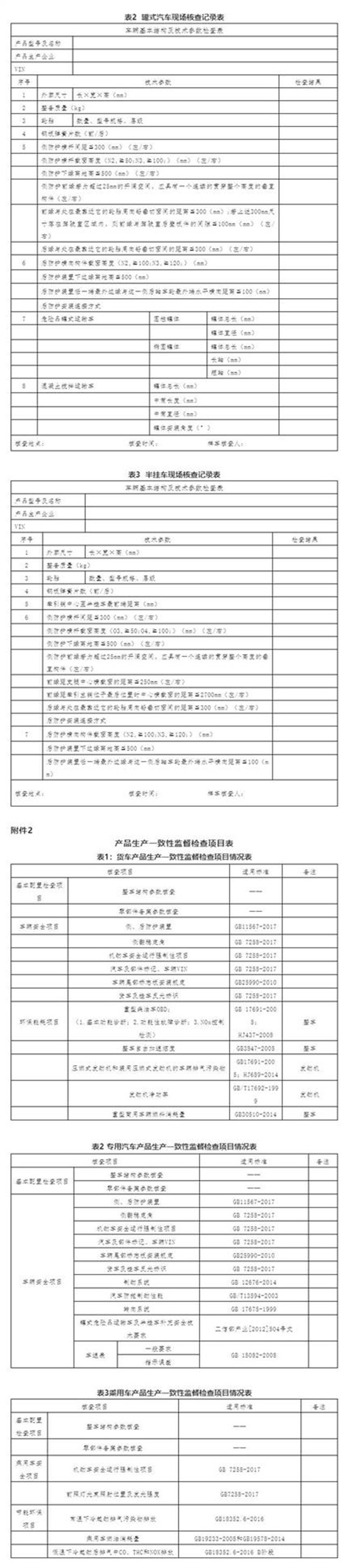 (一)现场检查:主要检查车辆整备质量、轮胎型号规格、钢板弹簧片数、罐体尺寸、后部防护装置、反光标识等关键技术参数(见附件1)。