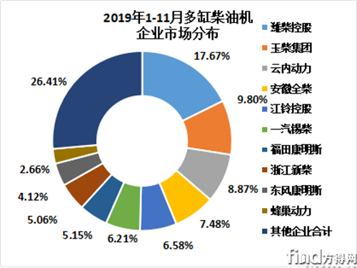 重汽、杭发,其前十名销量占总销量82.01%;潍柴在商用车用多缸柴油机市场份额中领先,占比19.20%,其后依次为江铃10.67%,玉柴10.21%,云内、福康、锡柴占比为8.01%~9.35%;全柴、东康、重汽、杭发占比为2.56%~5.44%。