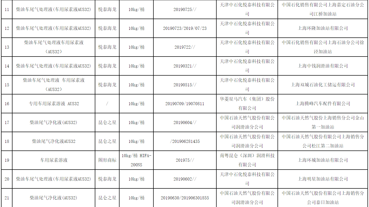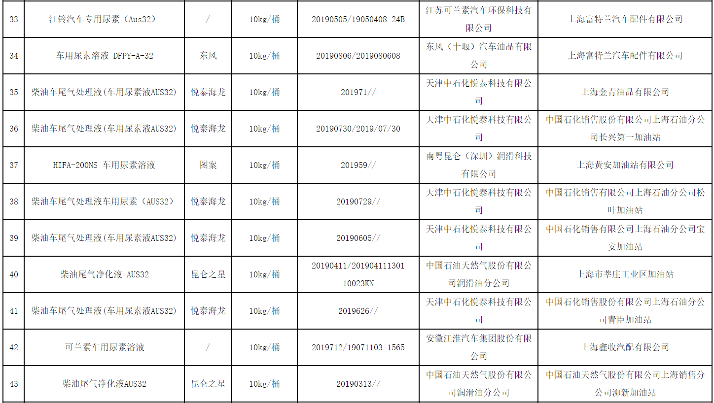 中国质量新闻网讯 12月30日,上海市市场监督管理局官网发布2019年上海市柴油发动机尾气处理液产品质量监督抽查结果。近期,上海市市场监督管理局对本市销售的柴油发动机尾气处理液(以下简称车用尿素)产品质量进行了监督抽查。本次抽查了60批次产品,经检验,不合格5批次。