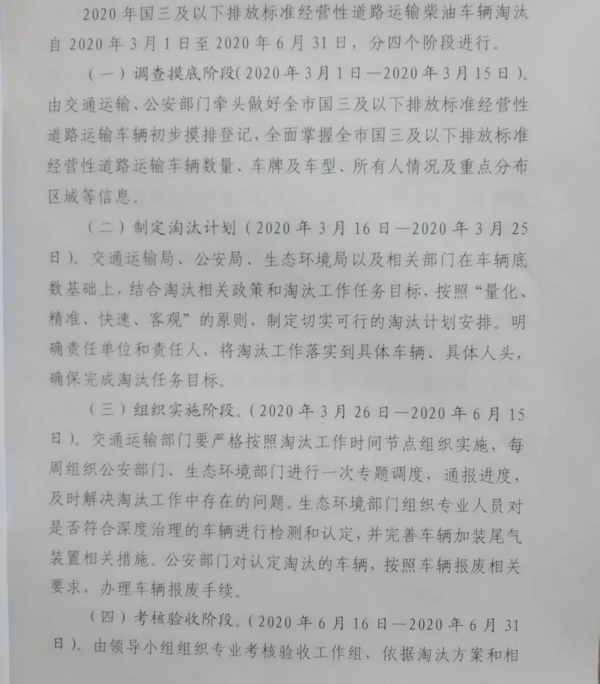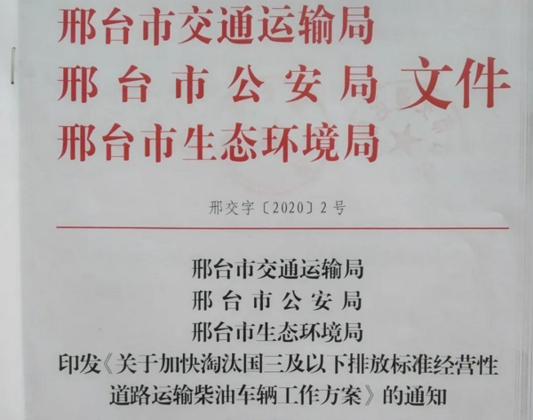 河北省邢台市三部门(交通运输局、公安局、生态环境局)近日出台了《关于加快淘汰国三及以下排放标准经营性道路运输柴油车辆工作方案》(以下称《方案》),引导、鼓励国三柴油车辆车主主动淘汰,对到达报废期限未报废的国三及以下柴油车坚决予以取缔。邢台市国三车淘汰分为四个阶段,目前已经完成前期调查摸底、制定淘汰计划这两个阶段,进入组织实施阶段,也就是国三车淘汰正式开始,时间从2020年3月26日—2020年6月15日,在这个阶段内,公安部门对认定淘汰的车辆,按照相关报废要求,办理车辆报废手续。2020年6月15日—2020年6月30日是考核验收阶段。