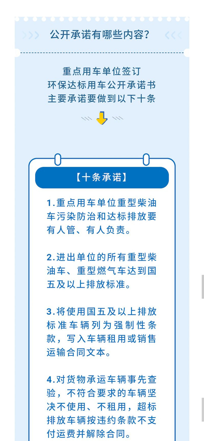 根据规定,这些重点用车单位需要签订《重点用车单位环保达标用车公开承诺书》并作出承诺:进出单位的所有重型柴油车、重型燃气车达到国五及以上排放标准; 将使用国五及以上排放标准车辆列为强制性条款,写入车辆租用或销售运输合同文本; 对货物承运车辆事先查验,不符合要求的车辆坚决不使用、不租用,超标排放车辆按违约条款不支付运费并解除合同……