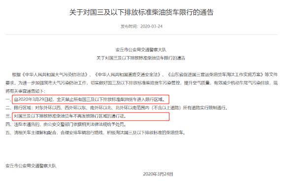 近日,河南安丘市公安局交警大队发布了“关于国三及以下排放标准柴油货车限行的通告”。“通告”规定,自2020年3月29日起,全天禁止所有国三及以下排放标准柴油货车进入限行区域,限行区域包括:对东外环以西、西外环以东、南外环以北、北外环以南范围内(不含以上道路)所有道路实行限制通行。“通告”要求,对国三及以下排放标准柴油货车不再发放限行区域的通行证;请相关车主理解和配合,合理安排车辆出行路线,积极淘汰国三及以下排放标准的柴油货车。