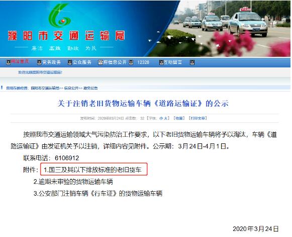 濮阳市是积极践行河南省公路货运转型升级政策的城市之一。2019年12月29日,河南省人民政府办公厅向下辖各相关单位转发了《关于加快全省道路货运行业转型升级促进高质量发展的实施意见》,《意见》要求:强化装备升级,积极稳步淘汰老旧货车,推广应用先进货运车型。建立完善国三及以下营运中重型柴油货车淘汰名录库,明确各地目标任务,力争2020年年底前全省淘汰国三及以下营运中重型柴油货车10万辆以上;对提前淘汰营运中重型柴油货车、高耗低效非标准汽车列车及罐车等老旧柴油货车的,统筹相关资金给予适当补助。