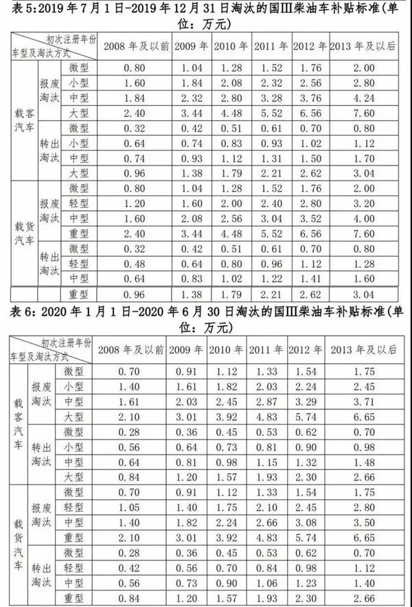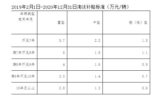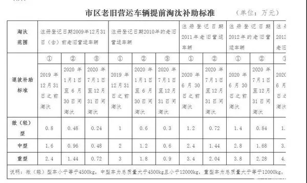 补贴标准:2019年11月30日前淘汰的给予100%补助;2019年12月1日至12月31日淘汰的给予80%补助;2020年1月1日至2020年1月31日淘汰的给予60%补助;2020年2月1日至2月29日淘汰的给予40%补助;2020年3月1日至3月31日淘汰的给予20%补助;2020年3月31日以后淘汰的不予补助。