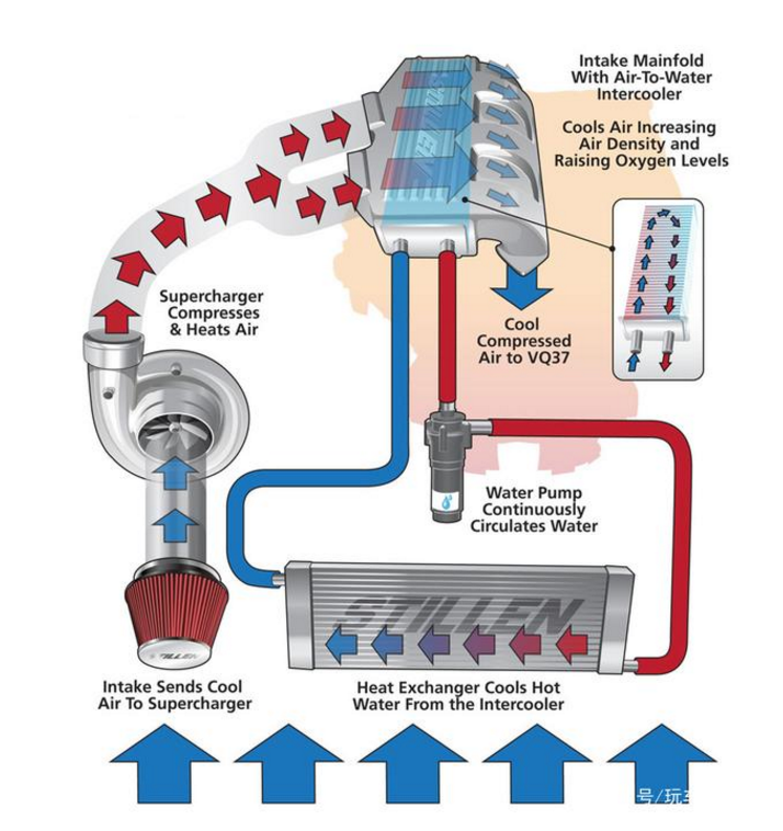 水冷式要复杂一些,同样是从涡轮得到压缩空气后,直接进入到水冷式中冷器,而有些水冷式中冷器是布置在进气歧管内部的(也不排除有的水冷式中冷在进气歧管外,需要看具体车型的布局),同时有另外一套冷却系统来冷却这个水冷式中冷器,所以会有冷却液流经中冷器,中冷器中会有很多通道让冷却液经过,并且可以让空气流过,经过中冷器的冷却液会被送到车头前方的一个热交换器,经过热交换器冷却后,又流回水冷中冷器中,空气流经中冷器的时候,就会被冷却液冷却。