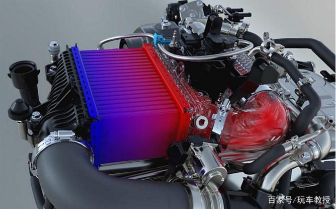该中冷器是水冷式中冷器,从上文可知,水冷式中冷器有冷却液经过,所以可以将空气的热量转移到冷却液中,进而冷却空气,增加单位体积的空气密度,达到更多氧气进入气缸参与燃烧,增加发动机输出的目的。