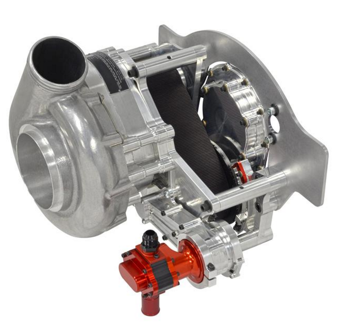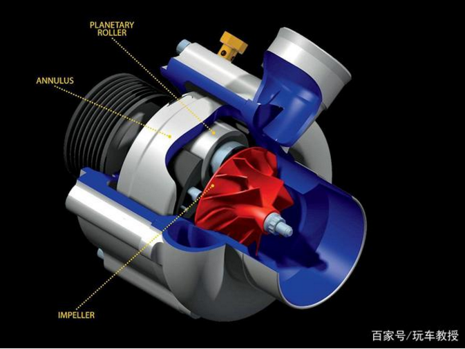 增压器有一个压气叶轮,当叶轮开始旋转时,就想一个反向的风扇,把管路中的空气吸入,空气被快速吸入离心式增压器,在出口处排出,随后进入到中冷器中冷却,再进入发动机燃烧。离心式增压器可以用V型皮带或者齿皮带带动,用一套行星齿轮组来让叶轮达到十万转,中间的太阳轮连接着增压器的叶轮,外齿环连接这一个齿轮,而这个齿轮被另外一个大齿轮用皮带驱动,而大齿轮是由发动机曲轴直接驱动,这样一来就实现了增压的效果。